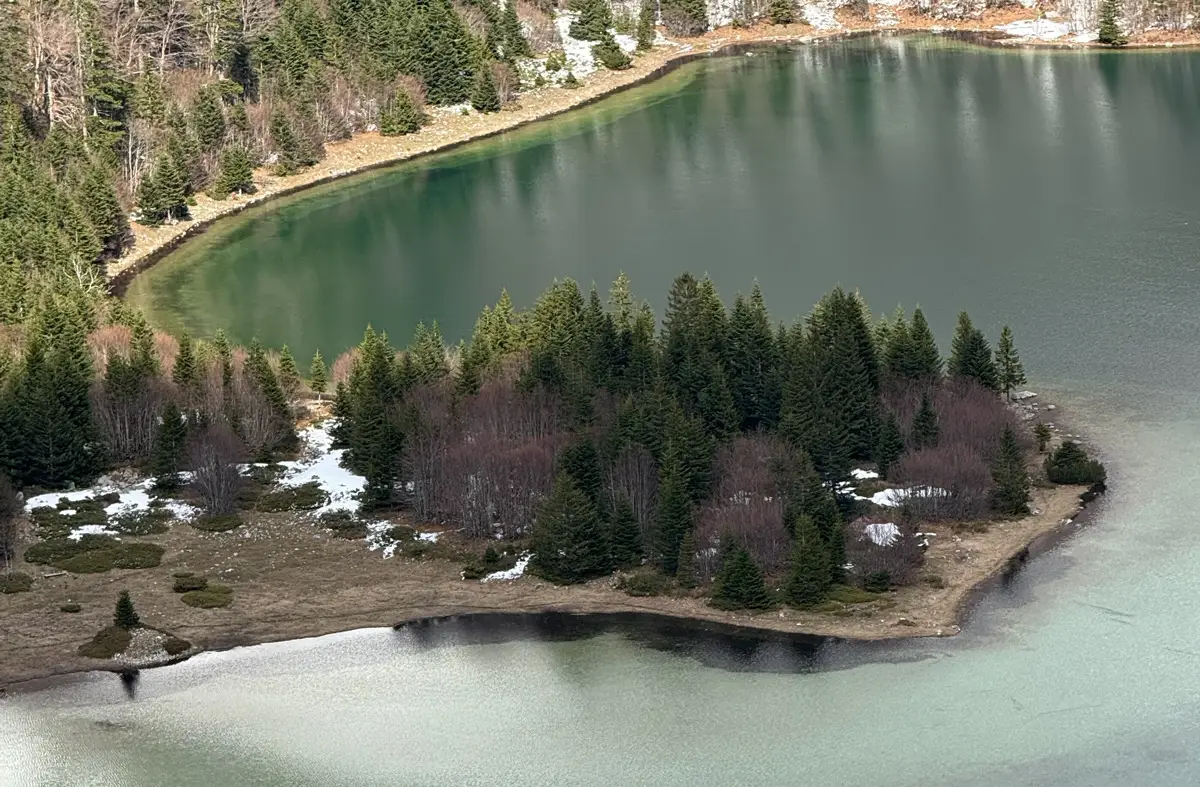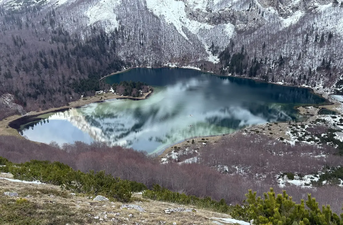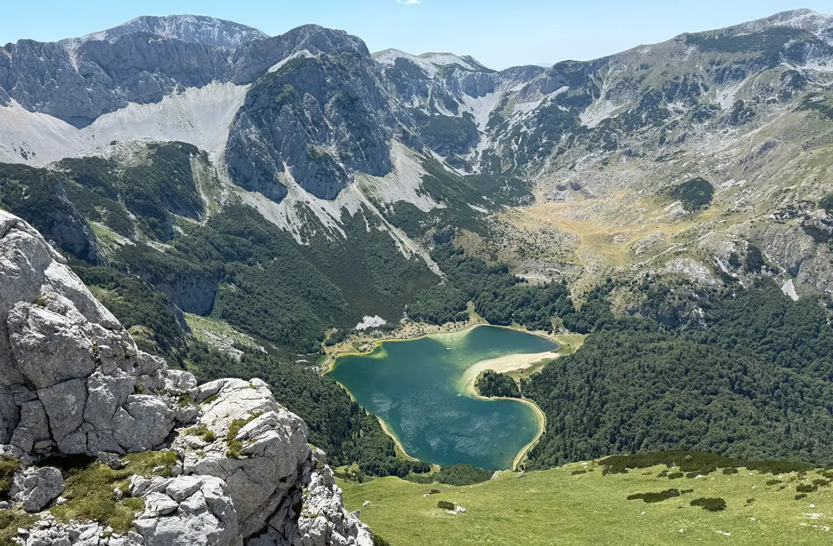 After crossing the border ridge into Piva Nature Park, the path gradually opens up toward the breathtaking, heart-shaped Trnovacko Lake. This is where you’ll have time to rest, take photos, enjoy a picnic by the turquoise water, or even take a refreshing swim in summer.